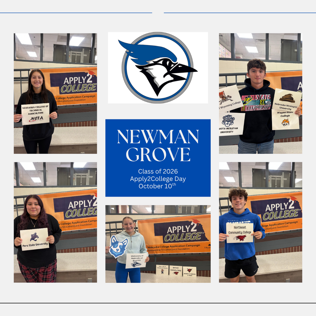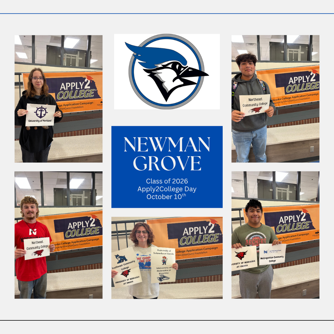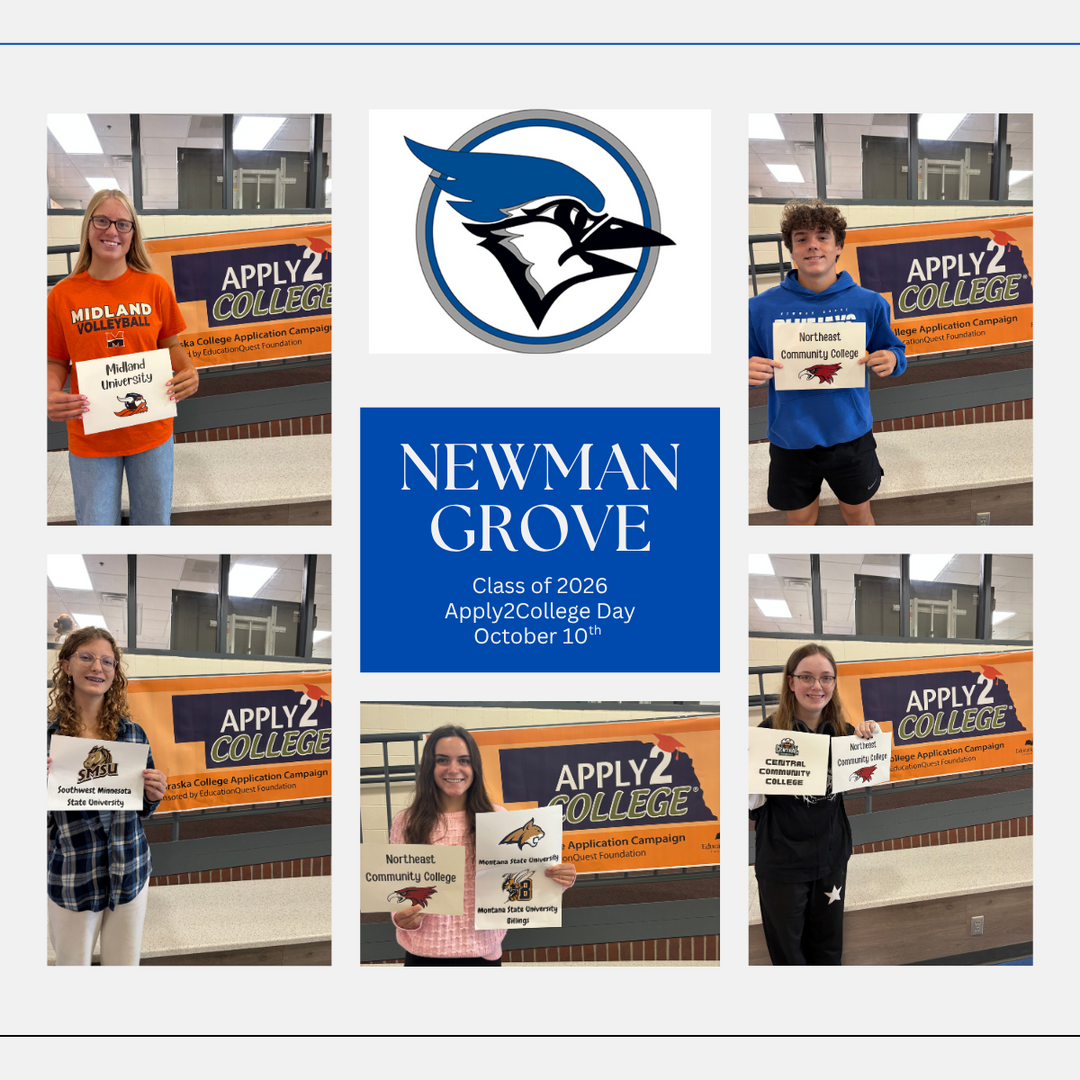 Congratulations to our 14 Newman Grove seniors who participated in this year’s Apply2College Day! Each senior took an important step toward their future by applying to at least one college of interest — and several applied to multiple schools! We’re so proud of their hard work and excitement for what comes next.